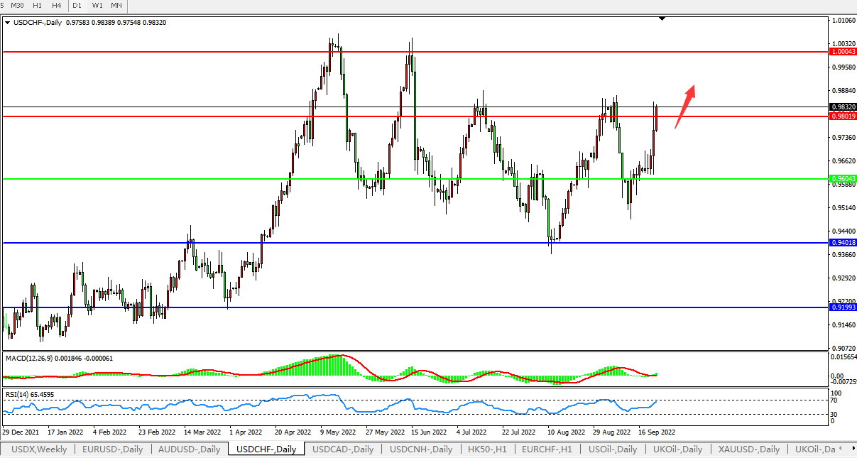 美元兑瑞郎本周大涨1.69%至0.9804。瑞士央行如期加息75个基点,政策利率从-0.25%升至0.50%,结束持续8年的负利率政策,但瑞士央行下调经济增速预测。