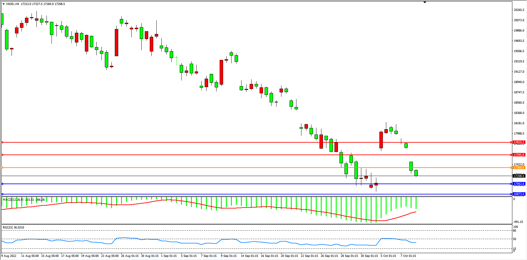 香港恒生指数10月10日(周一)收盘下跌523.39点,跌幅2.95%,报17216.66点;港股全天维持跌势,市场情绪表现低迷。恒指跌2.95%下挫超500点,恒生科技指数大跌3.98%,低见3382.9点再度刷新调整低价。权重科技股集体下挫拖累大市走低,美团跌6.7%,阿里巴巴、快手、京东均跌超3%,网易、百度、腾讯跌超2%;南下资金逆势净流入15.84亿港元,大市成交额为951亿港元。