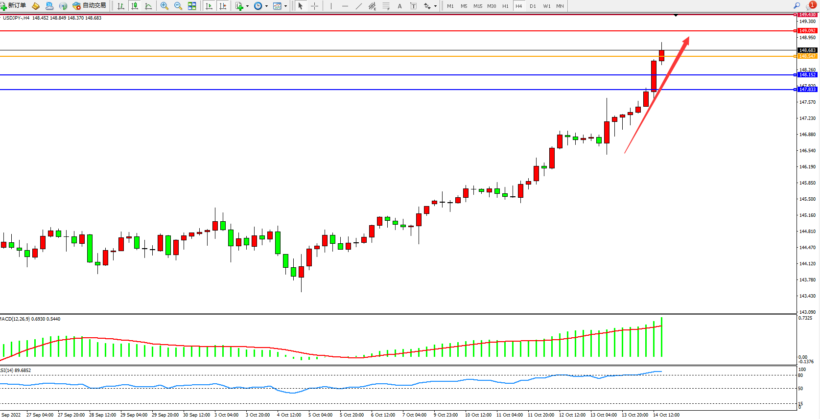 美元兑日圆维持148.683附近震荡,日本央行行长黑田东彦在华盛顿的联合新闻发布会上重申了其奉行宽松货币政策的承诺,这进一步加剧了日本央行与美联储之间的政策分期。因此在美元息口进一步有提升的前景之下,美元兑日圆始终尝试往更高水位挺进。