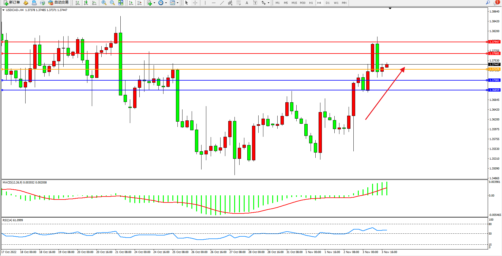 4小时图看:多头动力强势拉升上扬,短期高位震荡后有继续上移迹象,MACD指标处于多头区域高位徘徊,RSI指标处于50均衡线市场整理;