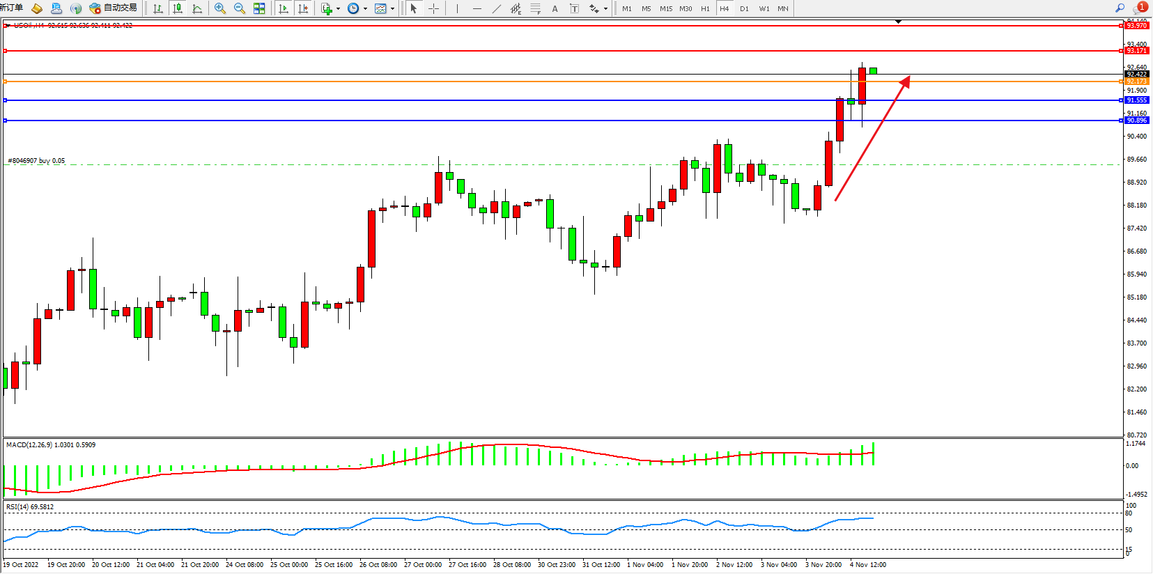 4小时图看:多头动力高位强势拉升,短期看涨情绪 涌现,市场多头有继续向上移动态势,MACD指标处于多头区域持续上移,RSI指标处于多头区域高位整理;