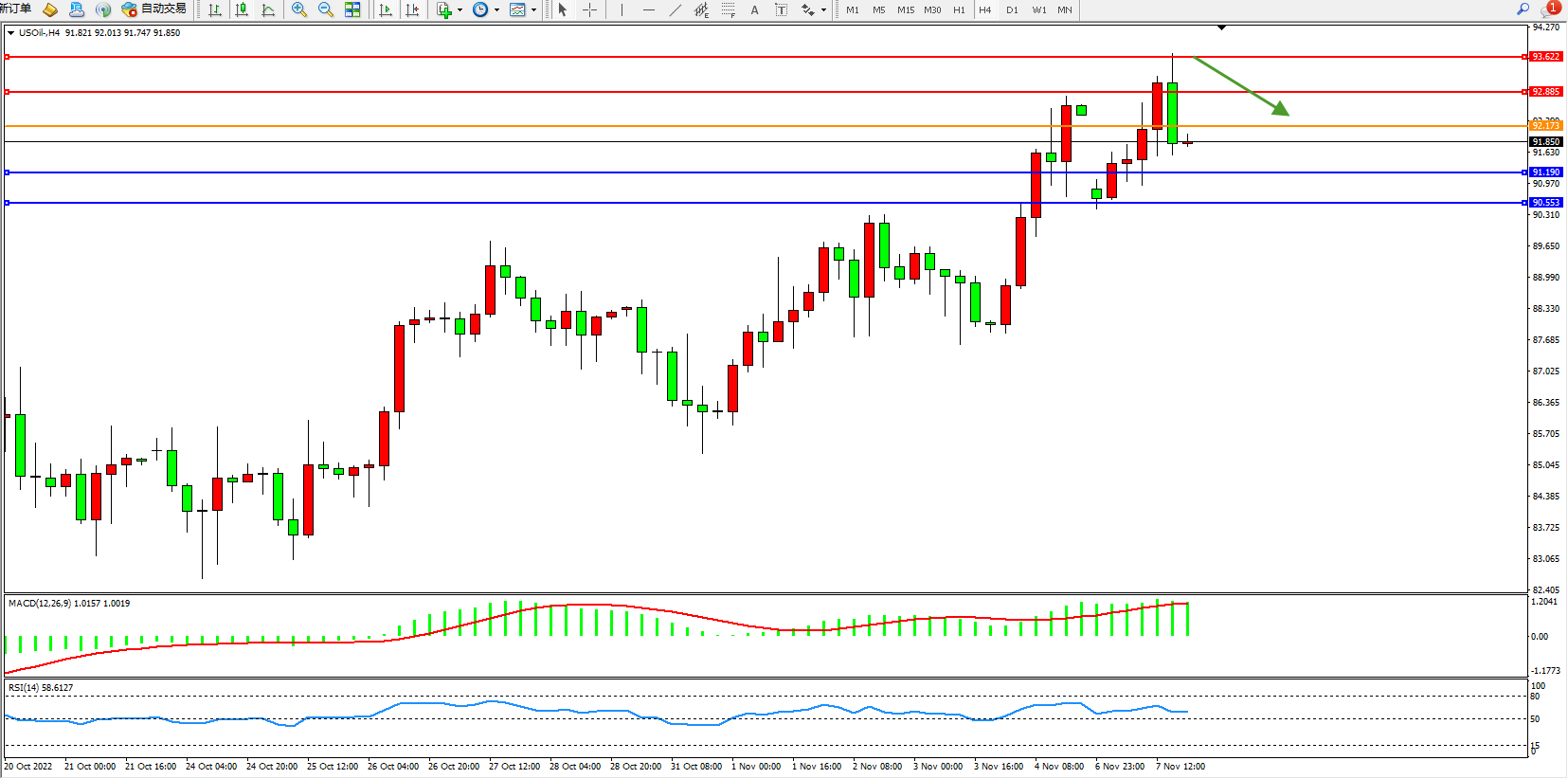 4小时图看:高位窄幅震荡,市场多头开始有减弱迹象,MACD指标处于多头区域高位整理,RSI指标处于50均衡线上側徘徊;