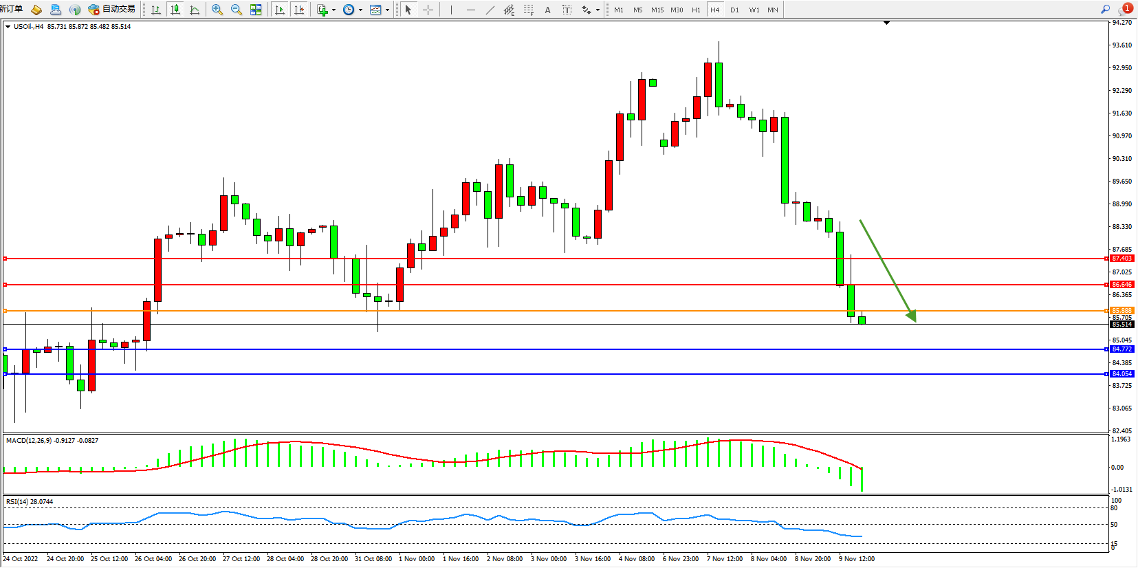 原油USOil——4小时K线图显示:
