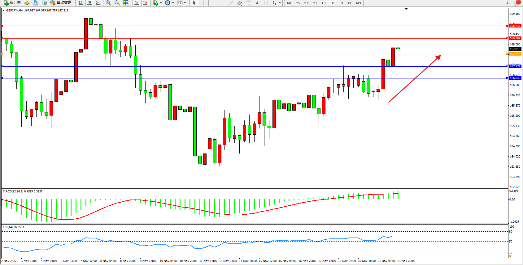 4小时图看:多头动力维持震荡上扬,短期看涨情绪涌现,市场多头动力持续攀升,MACD指标处于0轴线上側徘徊,RSI指标处于50均衡线上側整理;