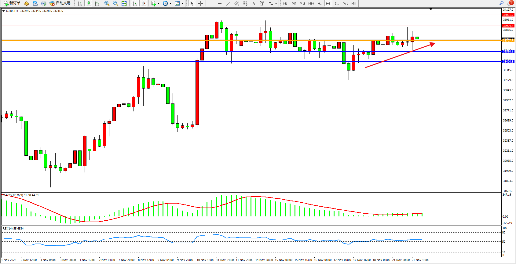 4小时图看:高位短期窄幅整理上移,市场看涨情绪开始缓慢涌现,逐渐向上移动中,MACD指标处于0轴线上側弱势徘徊,RSI指标处于50均衡线上側窄幅整理;