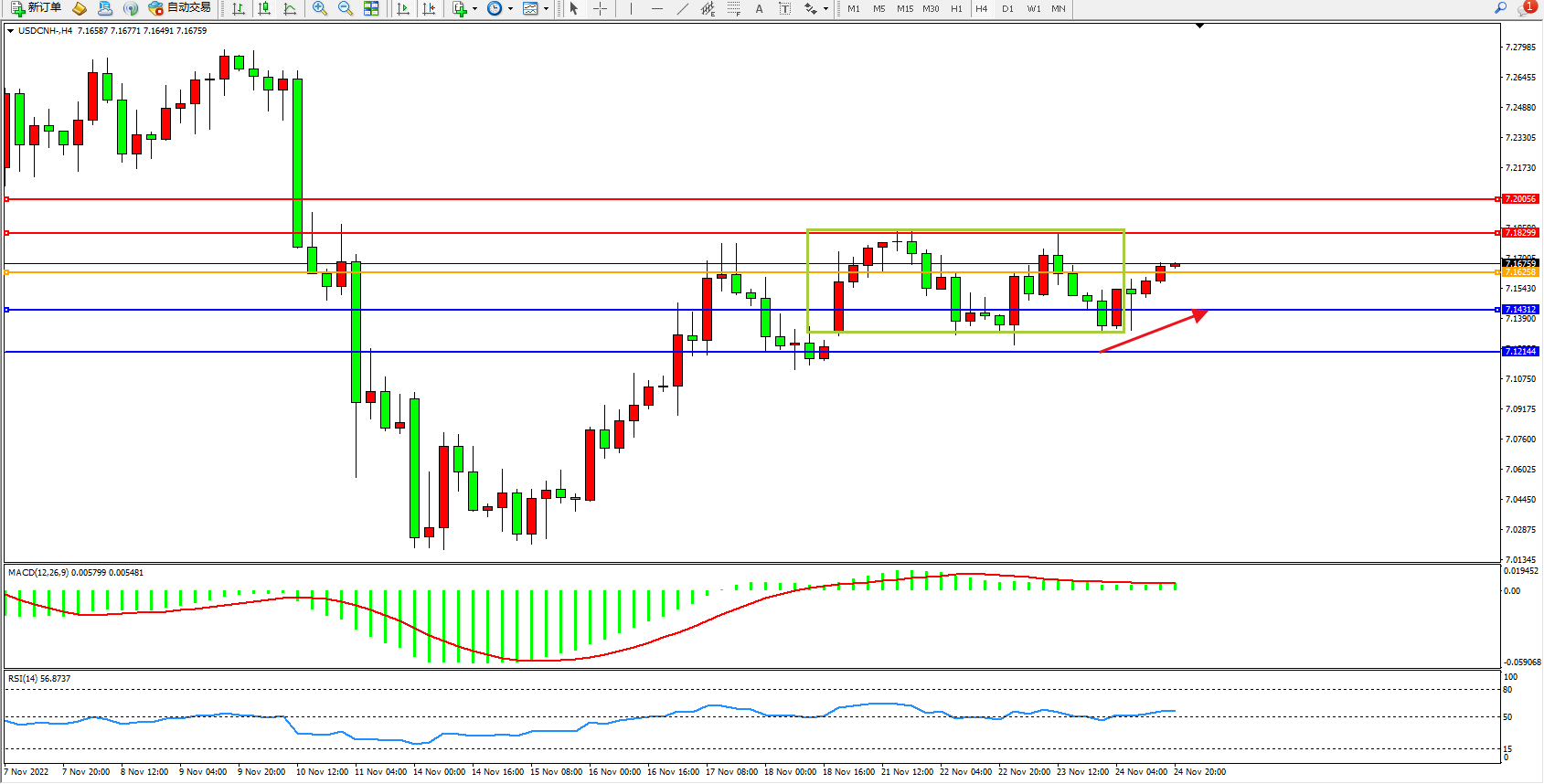 美元人民币USDCNH——4小时K线图显示: