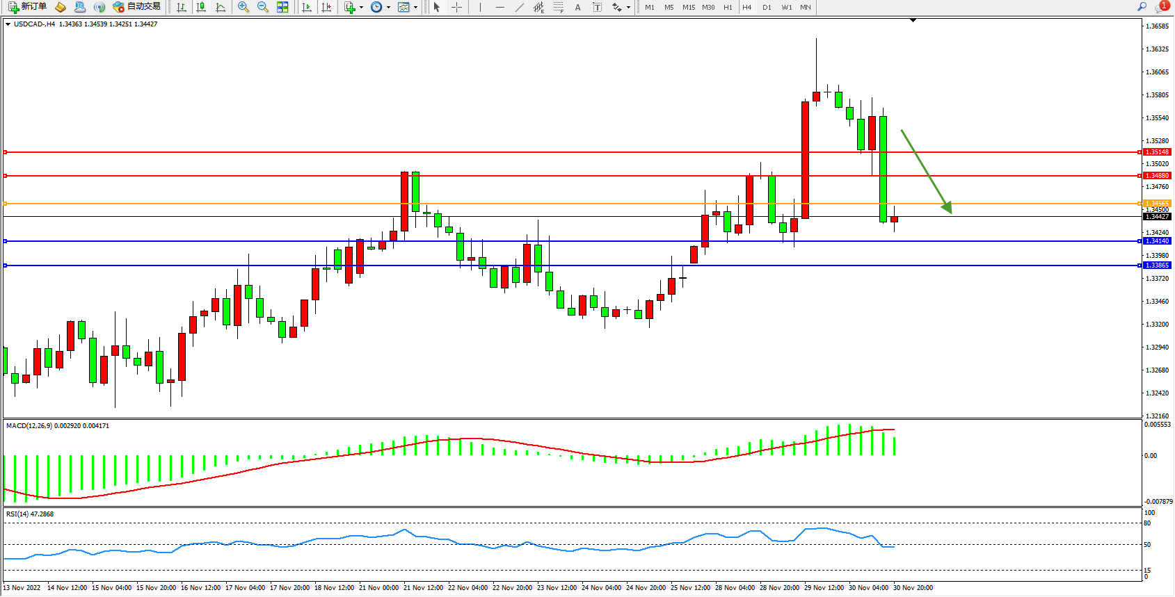 美元加元USDCAD——4小时K线图显示: