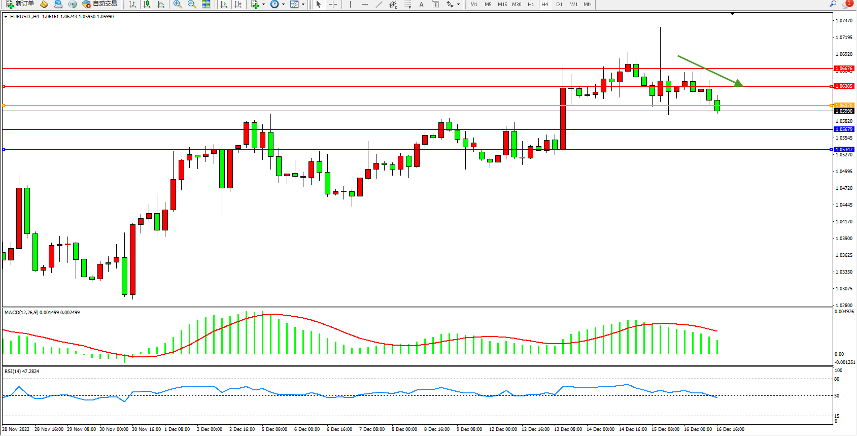 欧元美元EURUSD—4小时K线图显示: