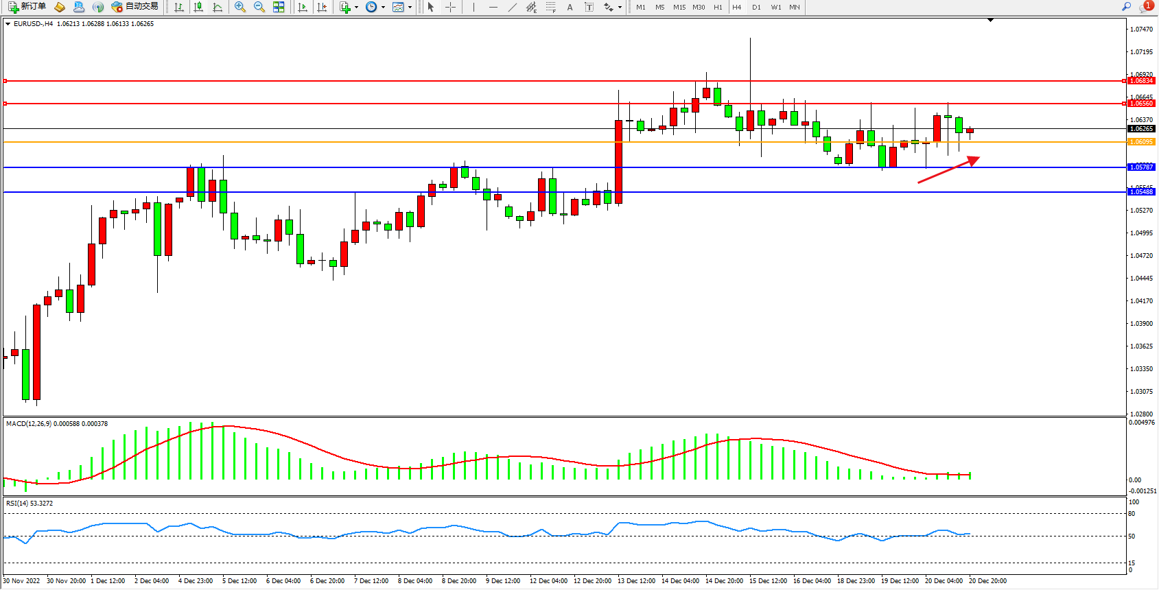 欧元美元EURUSD—4小时K线图显示: