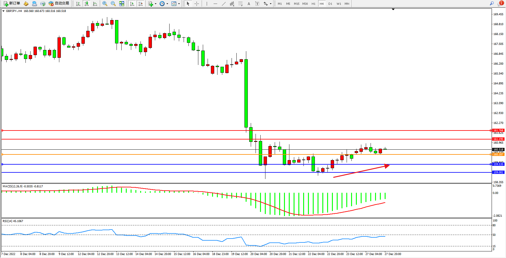 英镑日圆GBPJPY——4小时K线图显示: