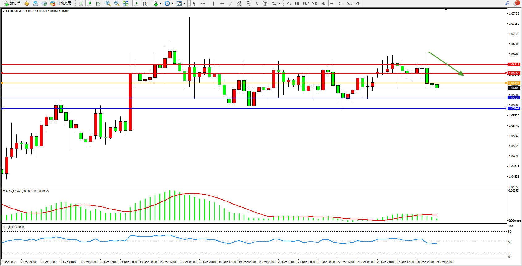 欧元美元EURUSD—4小时K线图显示: