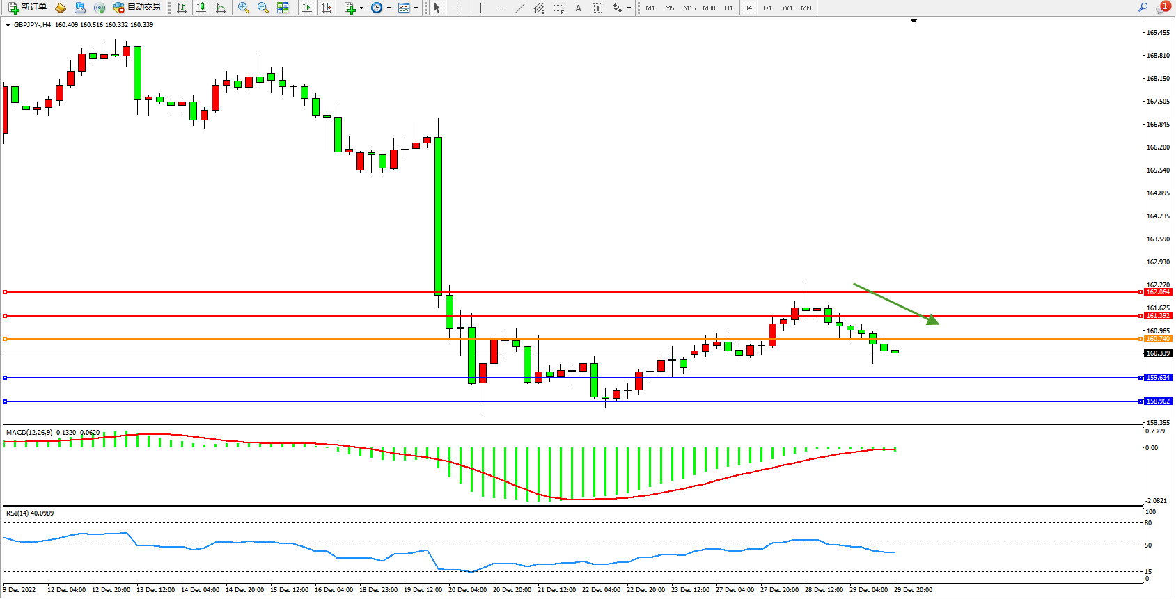 英镑日圆GBPJPY——4小时K线图显示: