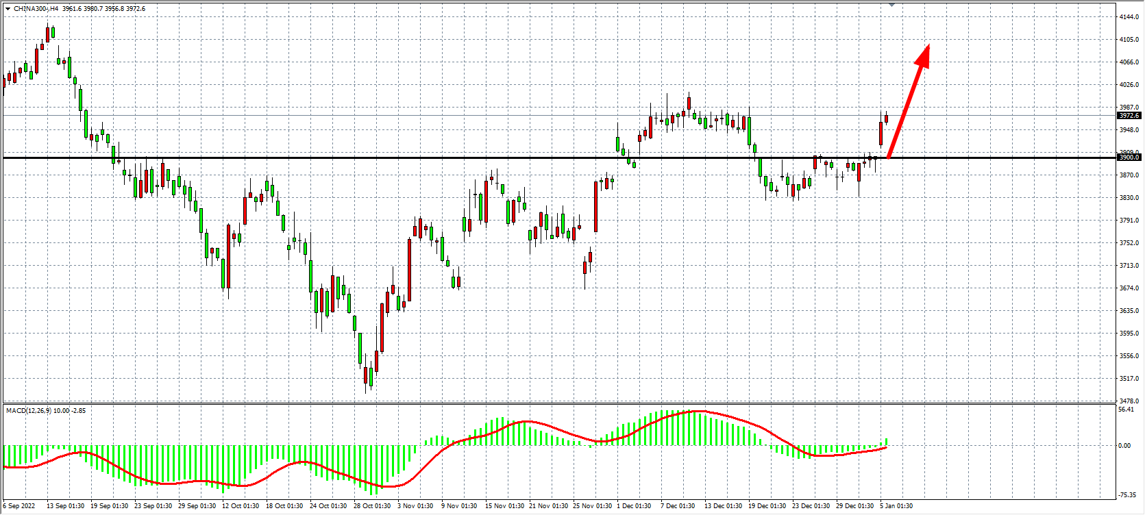 4小时图看,沪深300反弹一举突破3900,趋势回归强势,最终收盘在3970之上,同时MACD量能在零轴之上出现小幅放量,当前压力位3900已转化为强支撑,后期目标看4000-4080附近。