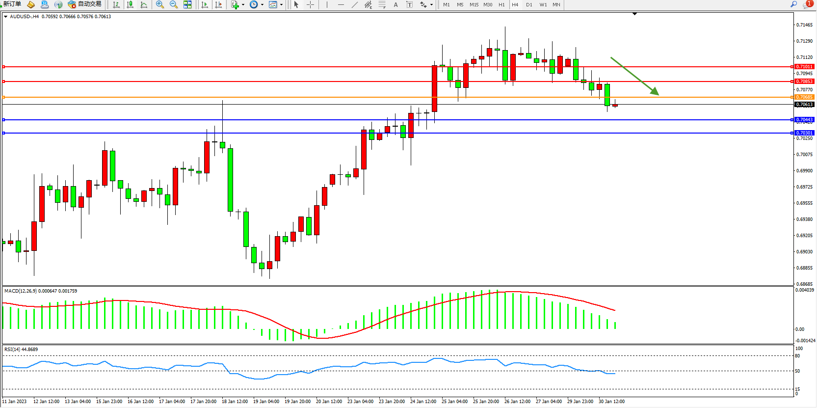 澳元美元AUDUSD——4小时K线图显示: