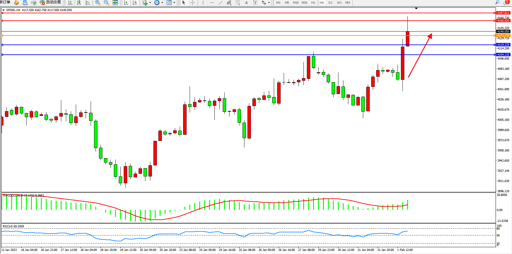 标普500指数2月1日(周三)收盘上涨44.00点,涨幅1.08%,报4120.60点;美联储将基准利率上调25个基点至4.50%-4.75%区间,符合市场预期,为连续第二次放缓加息步伐。