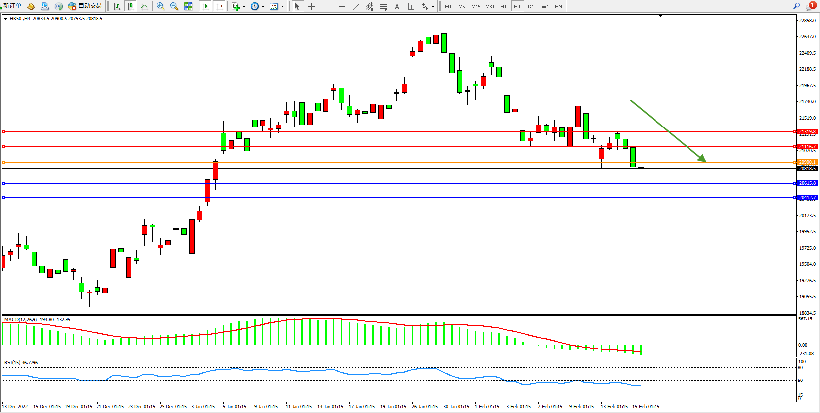 香港恒生指数2月15日(周三)收盘下跌301.59点,跌幅1.43%,报20812.17点;港股主要指数全线收跌,恒指跌1.43%下挫300点,国指跌1.3%,恒生科技指数跌0.97%,三者均创回调新低。 大型科技股多数下跌,快手跌2.3%,网易、阿里巴巴、美团跌超1%,南下资金大幅净流入70.84亿港元,大市成交额为1123亿港元。