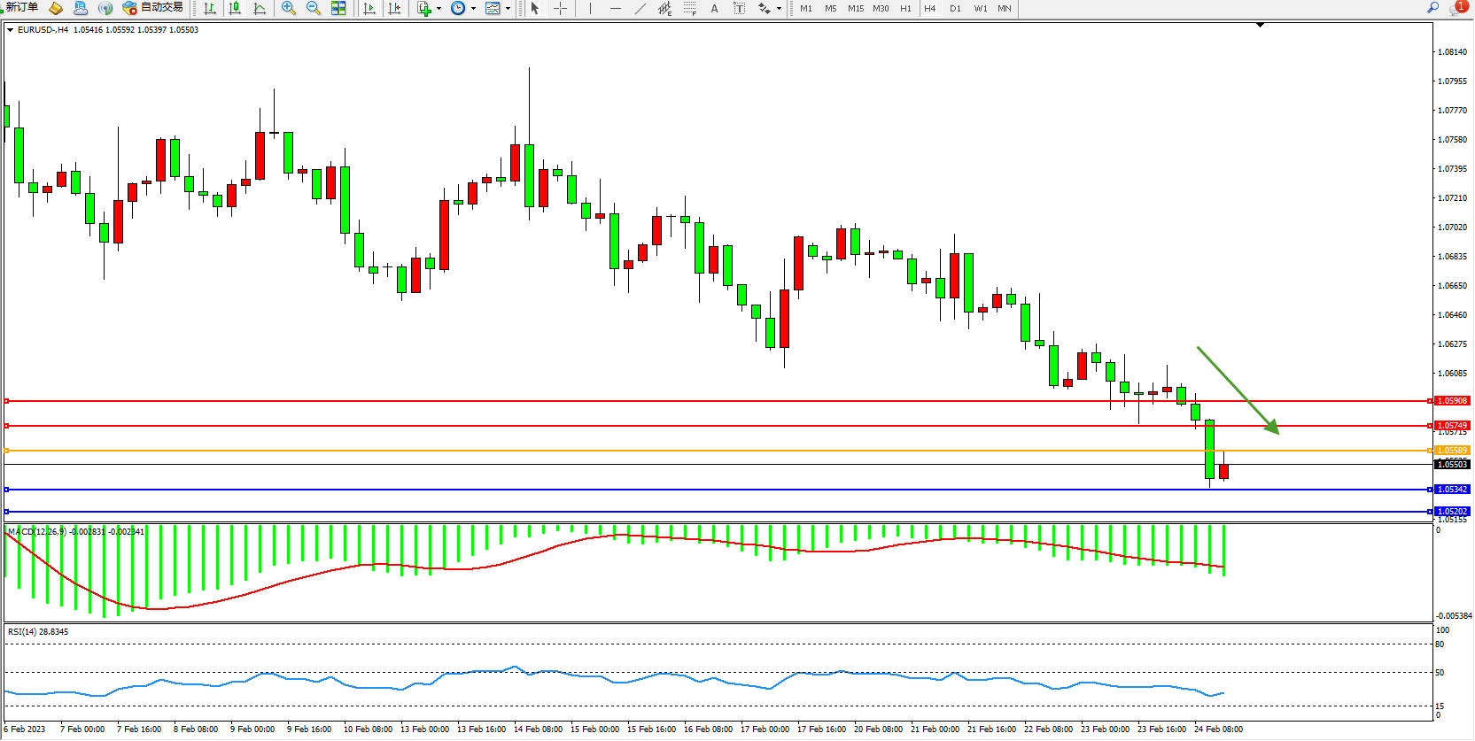 欧元美元EURUSD—4小时K线图显示: