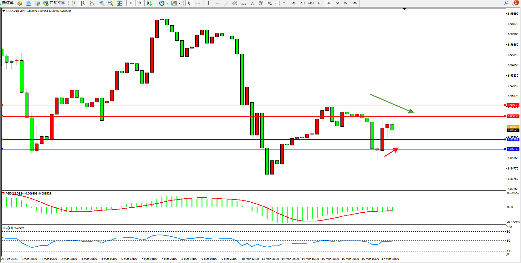 备选策略:6.88800上方看涨,目标6.89838  6.90936