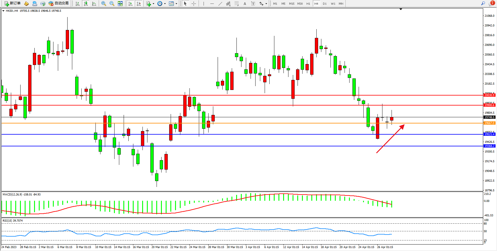 4小时图看:空头动力维持震荡下行后,低位短期震荡,市场跌势开始减弱,多头动力有伺机入场迹象,MACD指标处于0轴线下侧徘徊,RSI指标处于50均衡线下侧弱势整理;