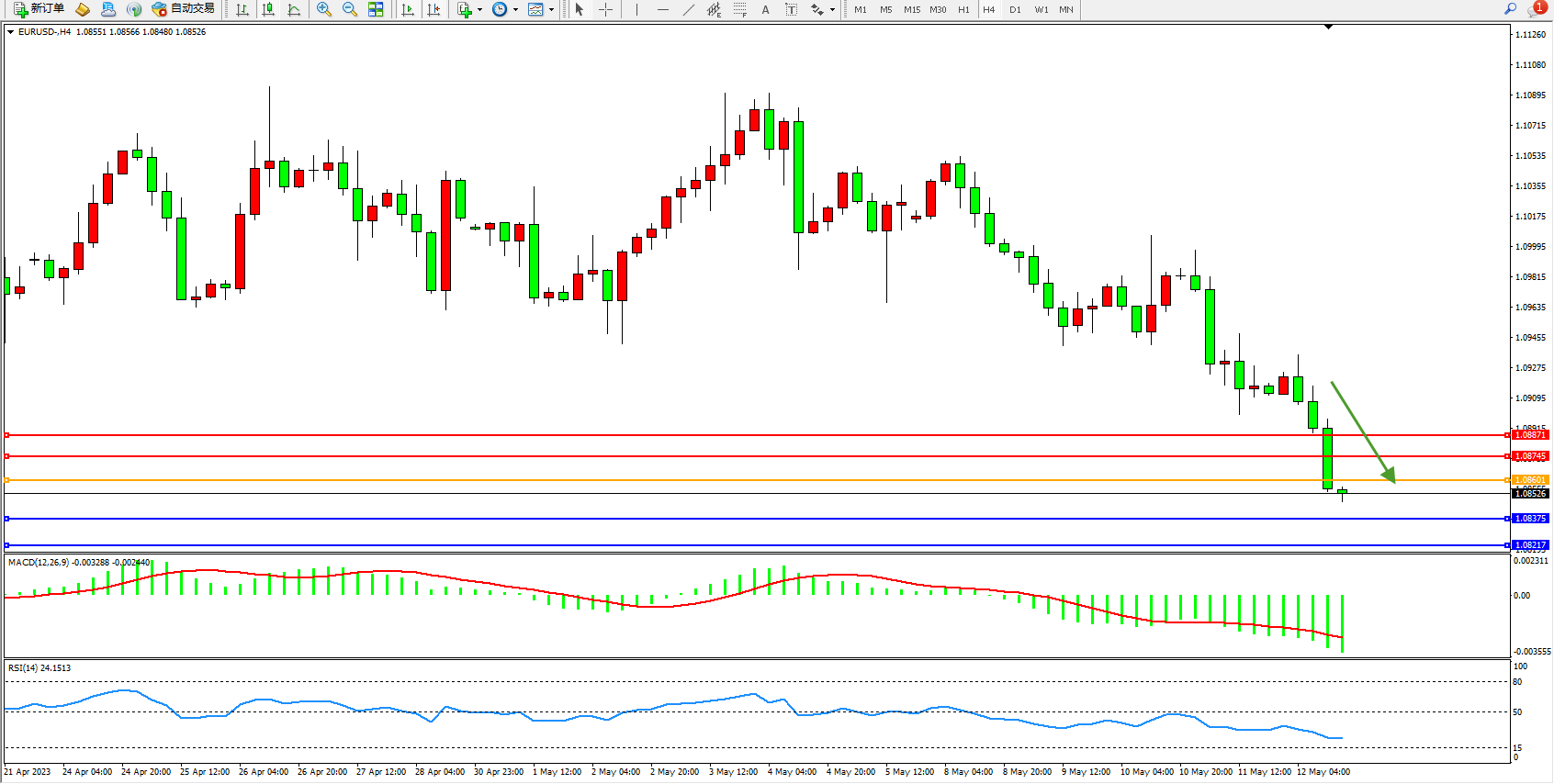 欧元美元EURUSD—4小时K线图显示: