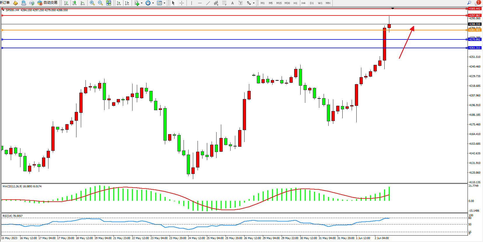 标普500指数6月2日(周五)收盘上涨59.58点,涨幅1.41%,报4280.60点;美国5月季调后非农就业人口 33.9万人,预期19.0万人,前值25.3万人。美国5月失业率 3.7%,预期3.50%,前值3.40%,为2022年10月以来新高。美国5月季调后非农就业人口录得增加33.9万人,为2023年1月以来最大增幅。