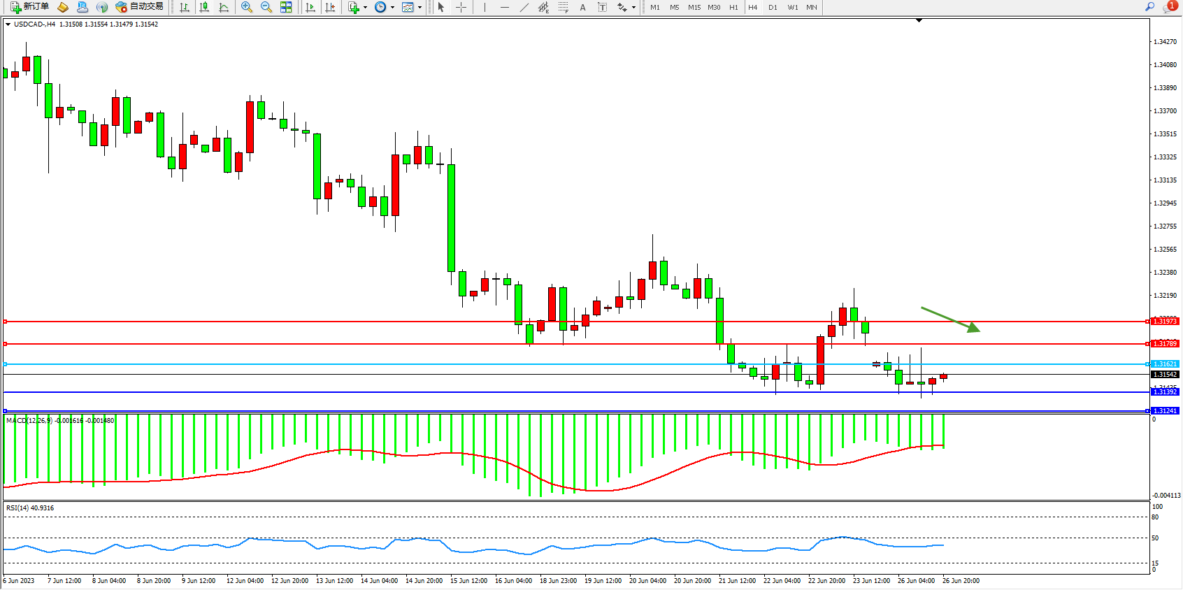 美元加元USDCAD——4小时K线图显示: