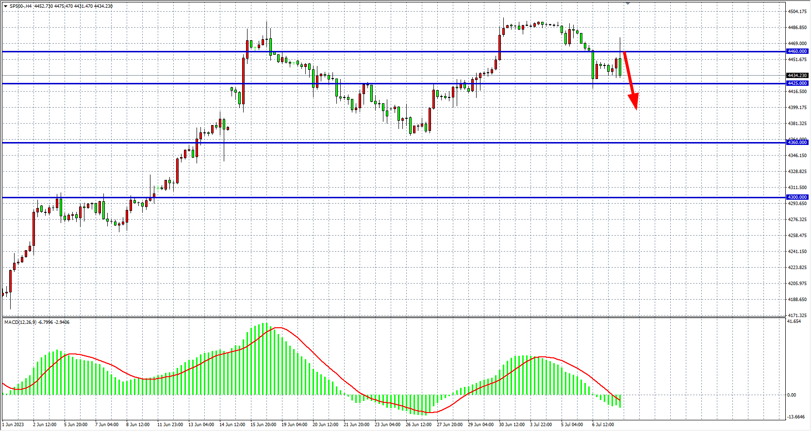 4小时图看,标普反弹4460后再度受阻回落,MACD量能维持在零轴下,行情进入盘整,上方阻力4460-4490,下方支撑4430-4400。
