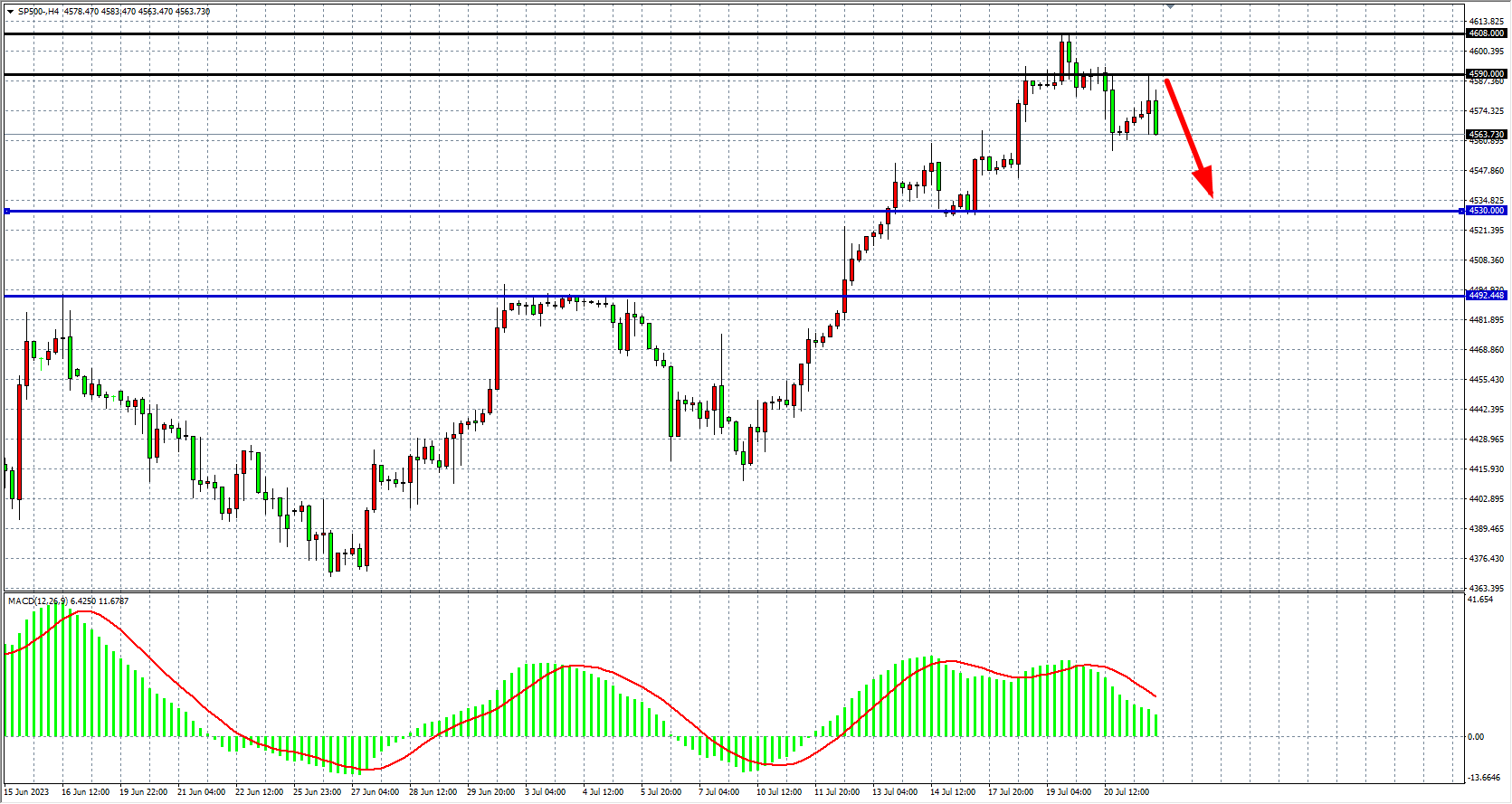 4小时图看,标普高位受阻回落延续,MACD量能在零轴上继续缩量,回调尚未结束,支撑关注4530-4500附近,阻力4590-4608。