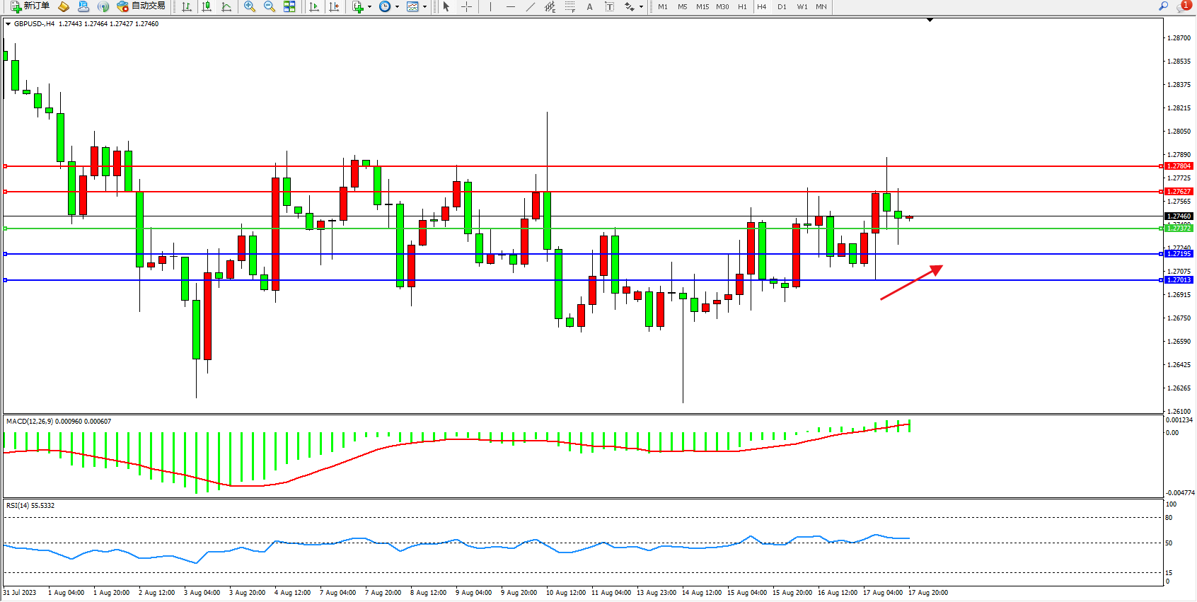4小时图看:多头动力维持震荡上移,市场看涨情绪笼罩,短期有继续向上移动迹象,MACD指标处于0轴线上側弱势整理,RSI指标处于50均衡线上側弱势徘徊;