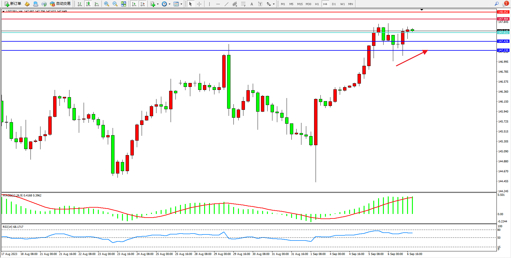 4小时图看:高位短期维持震荡,市场多头情绪持续,短期有继续向上移动态势,MACD指标处于多头区域高位整理,RSI指标处于多头区域高位震荡;