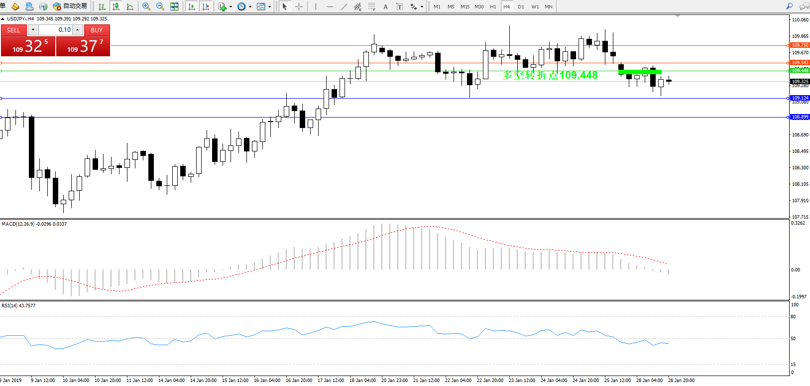 交易策略:109.448下方看跌,目标109.124、109.899