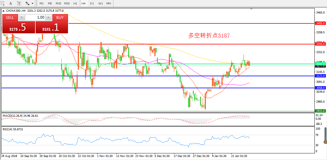 4小时图看,CHINA300中华指数经过整理突破并站稳200周期均线,整体价位依然在多空转折点之上。短期均线逐渐拐头, MACD红柱减少,暂时仍保持偏多思路。