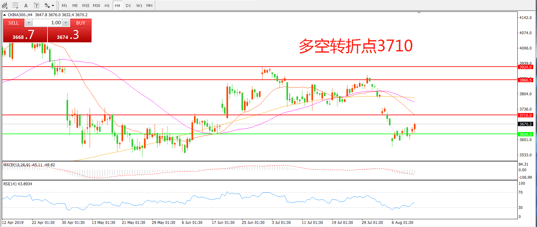 4小时图看,沪深300指数震荡反弹 ,整体表现有所回暖,均线系统有拐头迹象,MACD绿柱减少,RSI走平,日内延续震荡概率较大