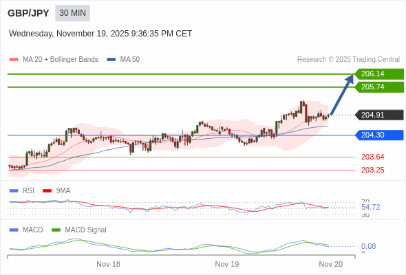 英镑/日元 当日内 : 看涨,当 204.30 为支撑位,目标定在206.14。