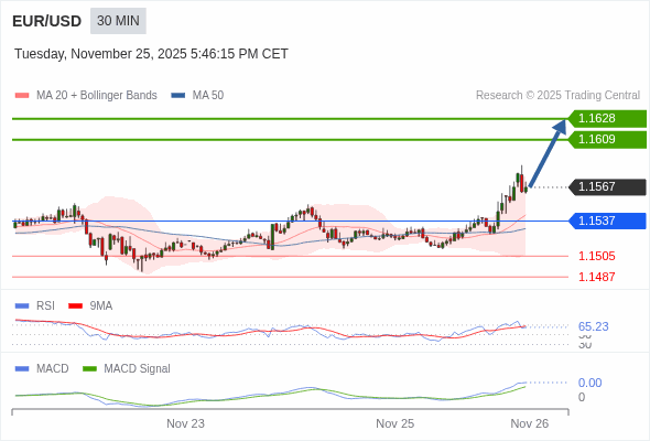 欧元/美元 当日内 : 看涨,当 1.1537 为支撑位。