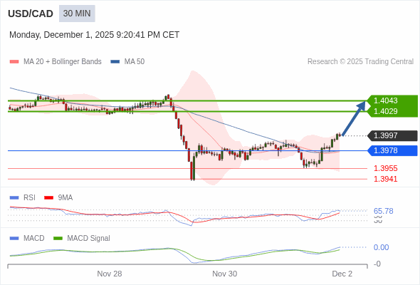 美元/加元 当日内 : 看涨,当 1.3978 为支撑位。