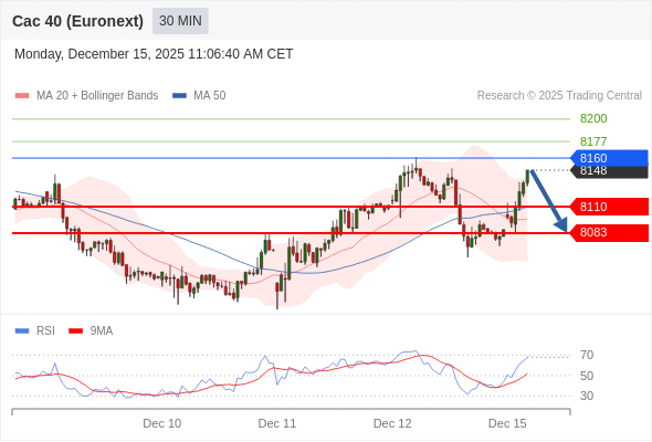 法国CAC指数期货 (Euronext) (Z5) 当日内: 短期关键阻力位在8160。