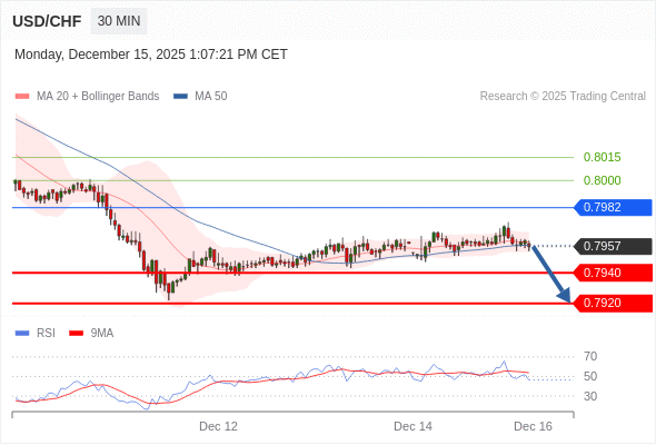 在 0.7970 之下,看跌,目标价位为 0.7940 ,然后为 0.7920 。
