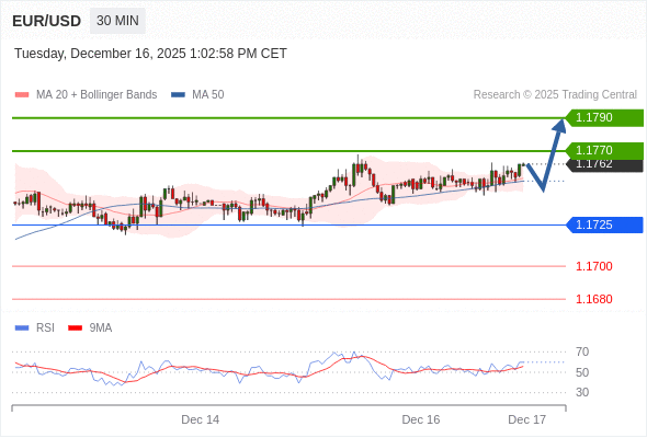 在 1.1725 之上,看涨,目标价位为 1.1770 ,然后为 1.1790 。
