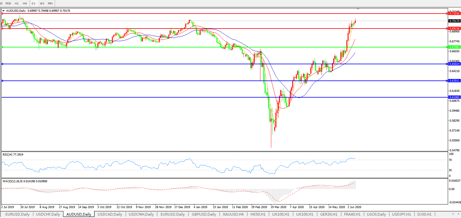 技术面简析:日图均线呈有序多头排列,汇价持续强势冲击0.70关口,MACD运行于0轴上方且量能快速放量,RSI超卖区域开始走平,预计汇价大概率将在整理蓄势后进一步上行。