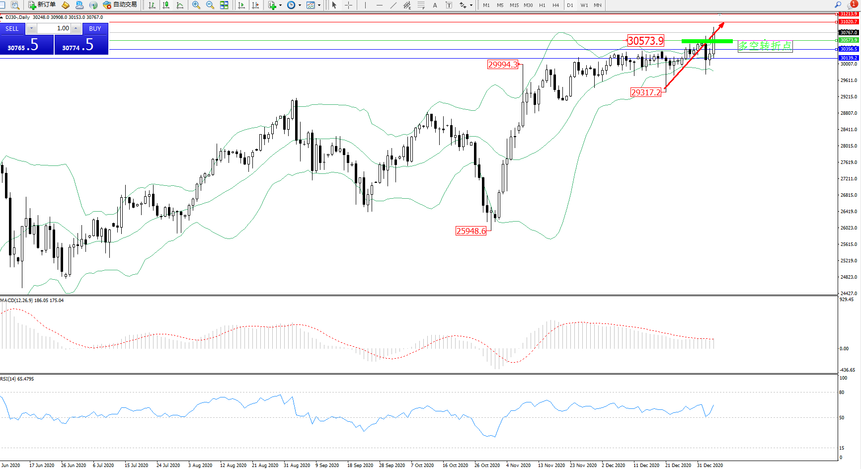 道琼斯指数1月6日(周三)收盘上涨437.80点,涨幅1.44%,报30829.40点。美股三大指数涨跌不一,道指收盘创新高,“小非农”ADP意外大幅度减少,美国12月ADP就业人数录得-12.3万人,为2020年4月以来首次录得负值。劳动力市场趋向紧张。大型和小型企业的就业人数都在减少,而中型企业的就业人数却录得增加。服务业的就业人数降幅最大。预计ADP公布后市场将会下调对12月非农就业人数的预期。投资者押注民主党将在乔治亚州的美国参议院决选中获胜,美债收益率劲升带动美元反弹;美联储周三发布的上月政策会议记录显示,美联储几乎一致决定维持购债计划不变,但为决策者未来是否以及何时做出改变留下了很大余地。