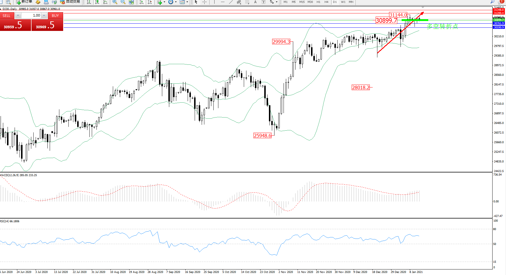 道琼斯指数DJ30—— 日K线图显示: