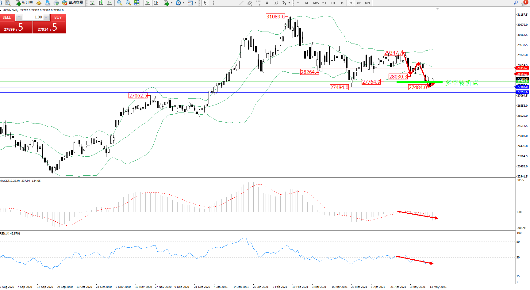 技术点评:空头动力延续布林带指标通道中下轨区间呈阶梯式震荡下行,低位抵达27484位置后得到短暂支撑反转上移,多头动力有伺机入场态势,布林带指标呈张口走势后开始缓慢收口,MACD指标处于0轴线下方空头区域弱势整理下移,RSI指标处于50均衡线下方空头区域维持窄幅整理中;