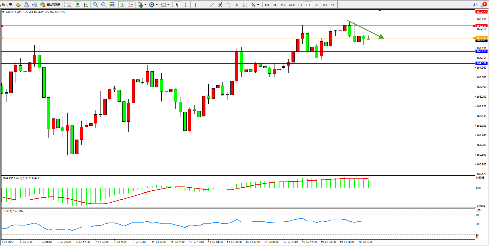 备选策略:165.537上方看涨,目标166.017、166.570
