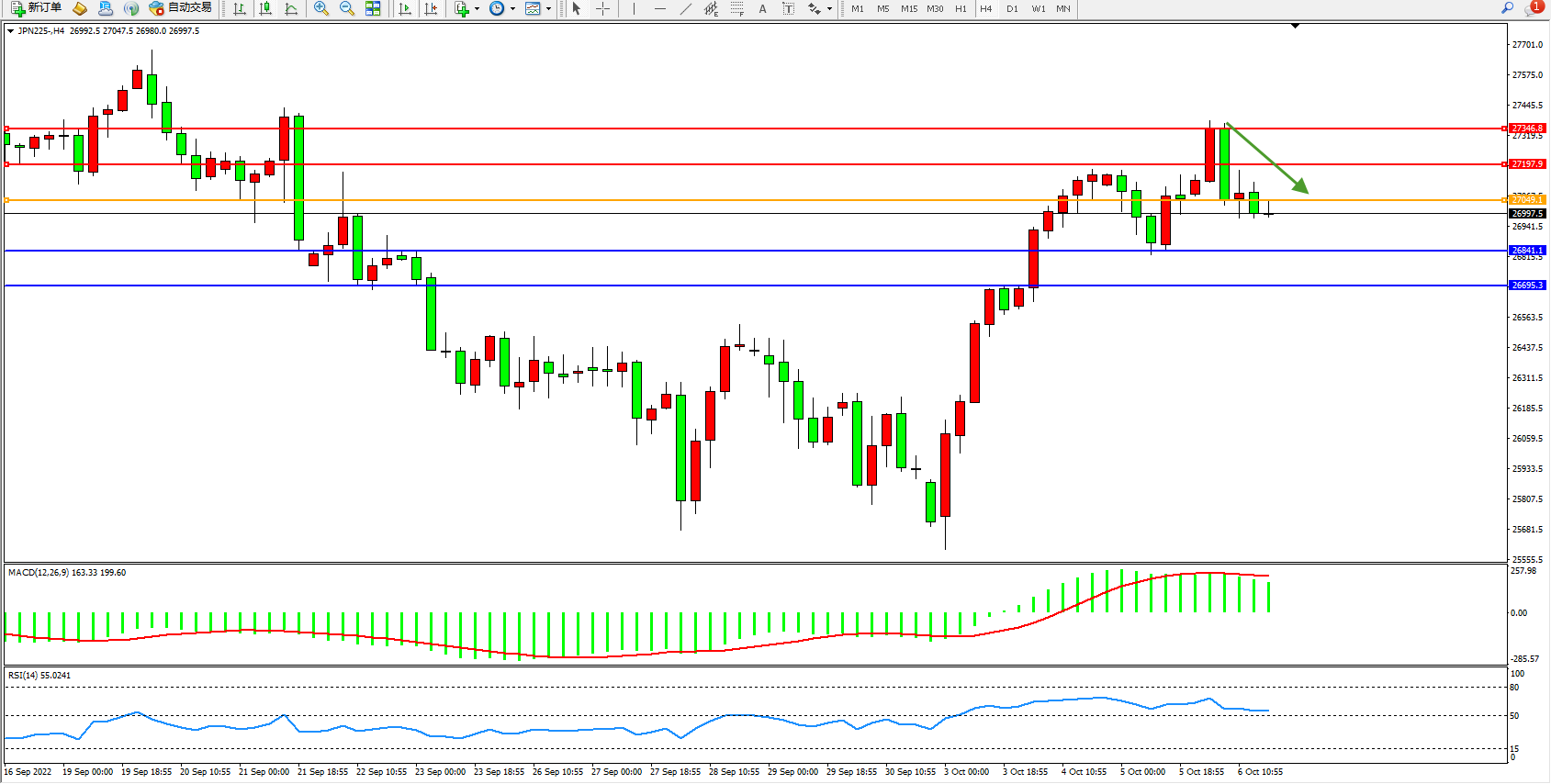 日经225指数10月6日(周四)收盘上涨198.47点,涨幅0.73%,报27319.00点。日本央行提高了日本9个地区中的1个地区(经济)的评估,其余8个地区的评估维持不变。日本央行表示,许多地区的经济出现温和回升。