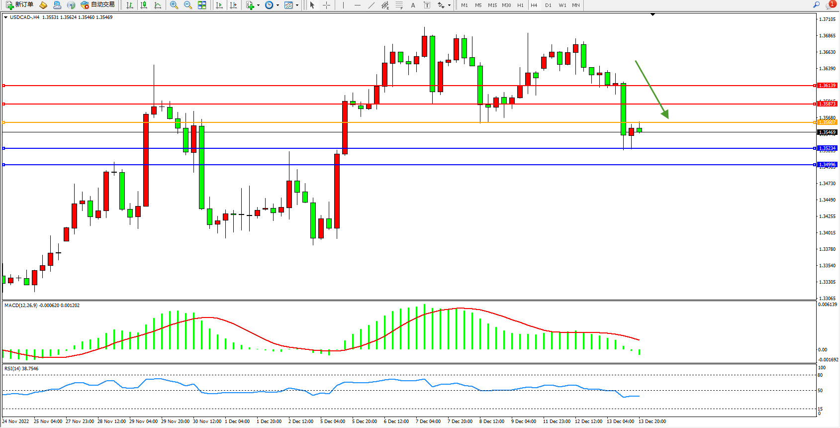 美元加元USDCAD——4小时K线图显示: